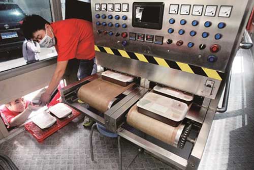 記者在現(xiàn)場看到,這種車是用大巴客車改造的。在大巴車下層放行李的地方有兩臺發(fā)電機。而車上全部座椅均被拆除,只剩一臺帶有兩條傳送帶以及監(jiān)視屏的機器。工作人員將從冷鏈貨運車上搬下來的盒飯放進機器的一頭,隨著監(jiān)視器上數(shù)字不停地變化,微微冒著熱氣的盒飯出現(xiàn)在傳送帶的另一頭。