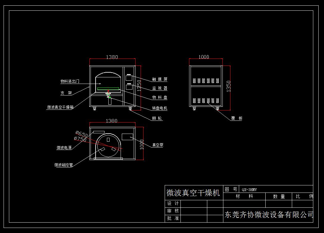 ●設(shè)備外框支架、真空泵機(jī)組、微波電源、微波磁控管、轉(zhuǎn)盤電機(jī)、物料盤、微波真空干燥箱、物料進(jìn)出門、監(jiān)視器、觸摸屏控制系統(tǒng)、排熱系統(tǒng)等。