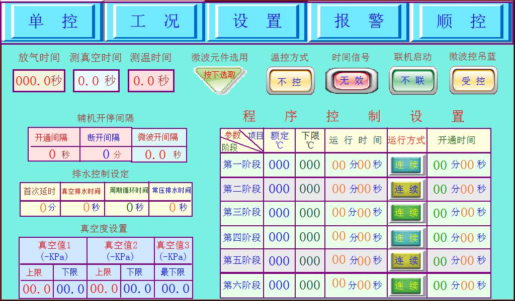 小型微波真空干燥機控制系統(tǒng)可以手動控制也可以自動控制,分六個階段,每個階段的真空度,溫度,微波功率都可調。